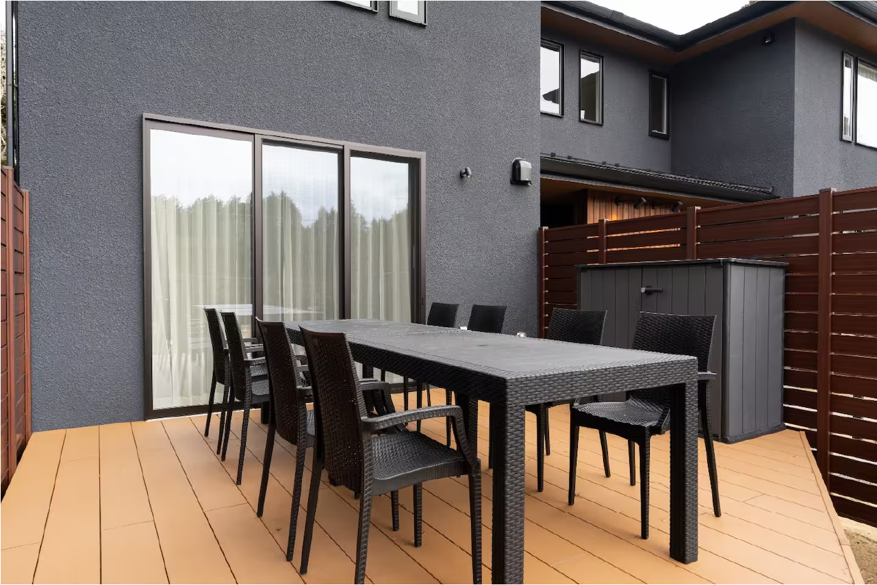 デッキテラスには広々としたテーブルと椅子を備え、屋外での食事やBBQをお楽しみいただけます。開放感のあるプライベート空間で、食事の時間をより特別なひとときとしてお過ごしいただけます。