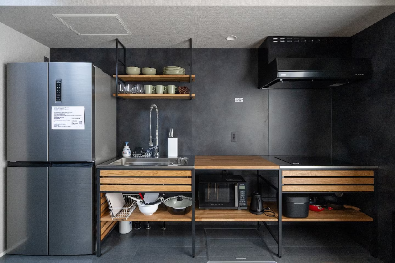 IHコンロ、大型冷蔵庫、炊飯器、電子レンジ、電気ポット、調理器具、食器とカトラリーが揃っているので、簡単な料理も可能です。