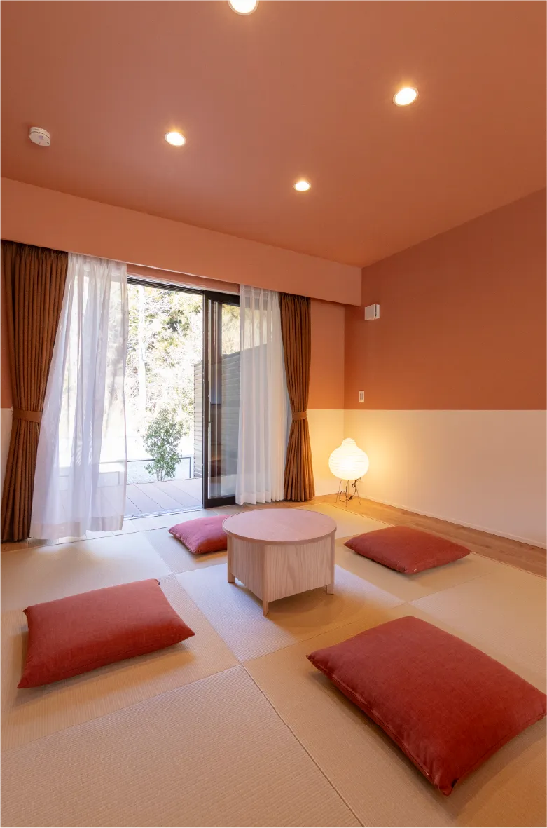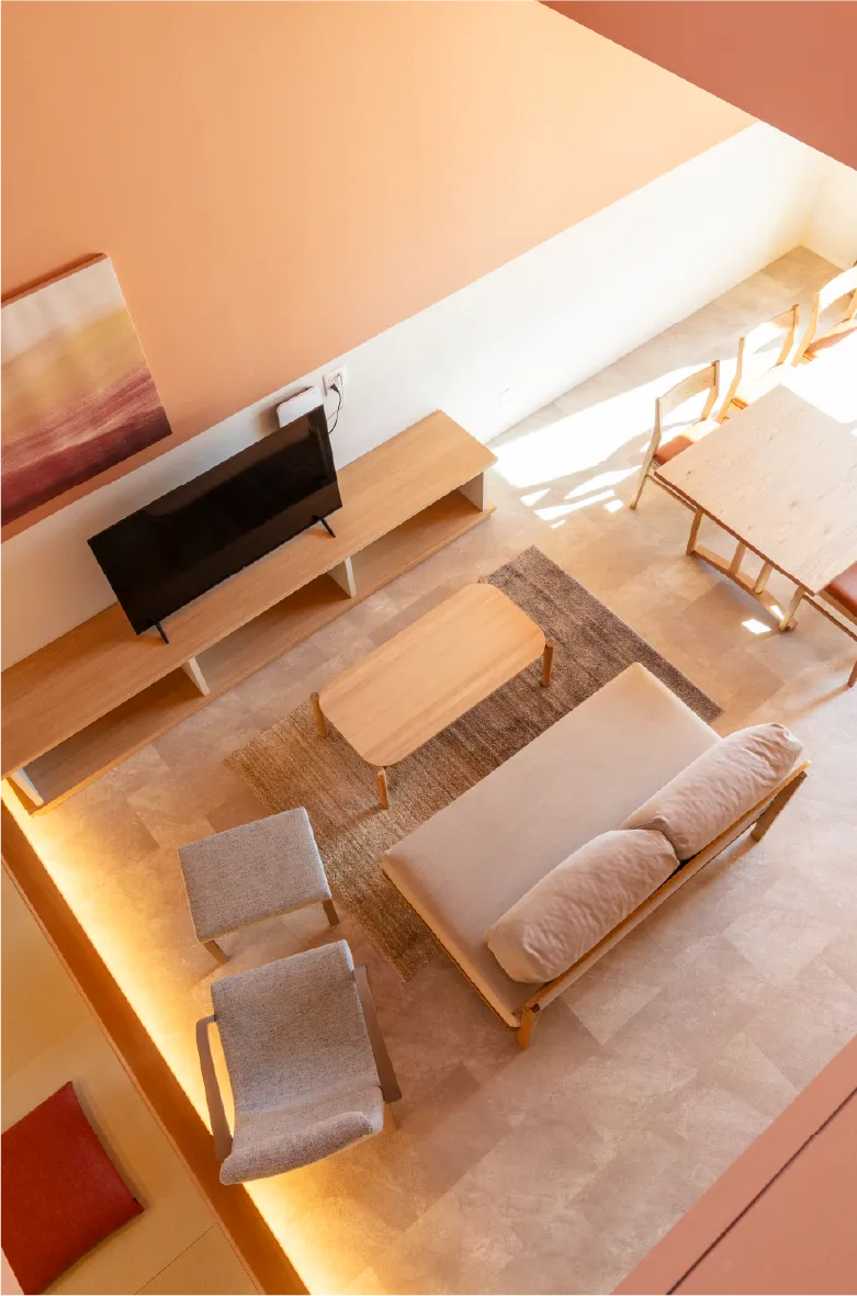 リビングには畳スペースを備えており、小さなお子様連れやグループでの滞在にも適しています。
